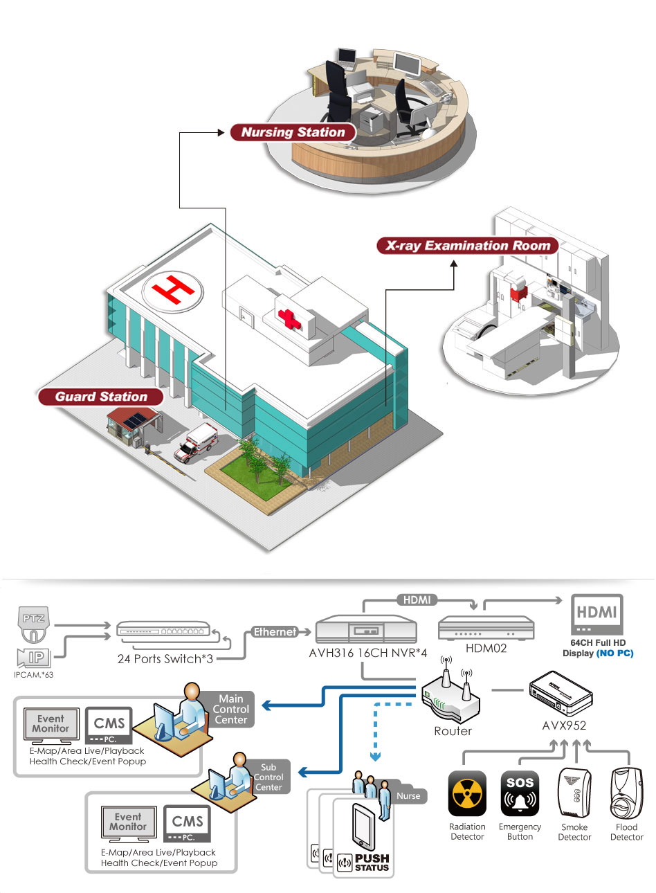 This new-built hospital needs to be installed surveillance system to handle the condition of patients and enhance the security. For immediately handling the emergency situation, the owner required an emergency button set in the wards for patient to press while crisis happening. And the nursing station on each floors must be able to monitor everywhere around the hospital, especially the wards. Furthermore, the X-ray room would be a key monitoring site. The nursing station should be informed if the radiation harmful to human body is leaking. Besides, the guard station needed a power camera, which is able to patrol multiple spots in the outer area of the hospital for overall control.